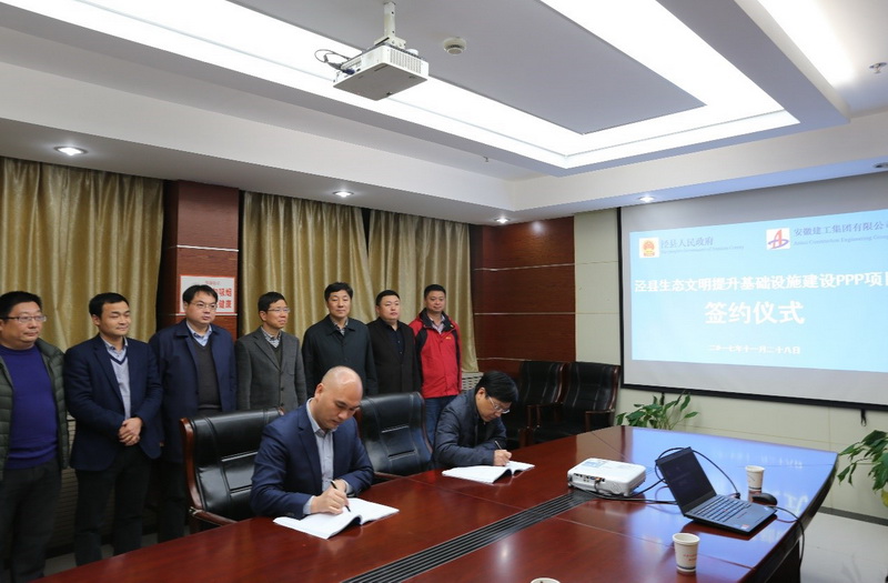 11月28日,集團(tuán)公司投資建設(shè)的涇縣生態(tài)文明提升基礎(chǔ)設(shè)施建設(shè) PPP 項目簽約儀式在涇縣舉行,安建投資公司總經(jīng)理朱忠明代表安徽建工集團(tuán)與涇縣人民政府簽約,集團(tuán)公司副總經(jīng)理、黨委委員王厚良出席簽約儀式。