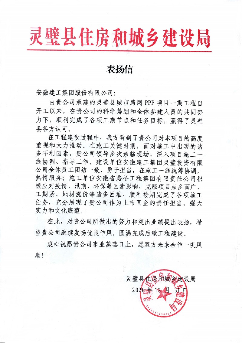 12月31日,靈璧縣住房和城鄉(xiāng)建設局向安徽建工集團股份有限公司發(fā)來表揚信,高度贊揚了公司投資建設的靈璧縣城市路網(wǎng)PPP項目一期工程2020年取得的優(yōu)異成績,充分肯定安徽建工的建設實力、責任擔當和良好企業(yè)形象。
