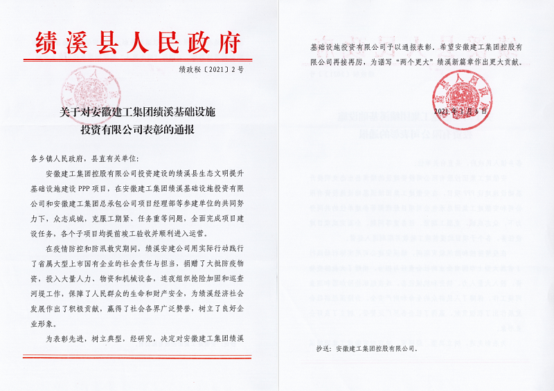 1月6日,安建投資所轄安徽建工集團(tuán)績(jī)溪基礎(chǔ)設(shè)施投資有限公司喜獲績(jī)溪縣人民政府通報(bào)表彰!自開工以來(lái),項(xiàng)目公司統(tǒng)籌協(xié)調(diào)參建各方,牢固樹立“開工即搶工”意識(shí),團(tuán)結(jié)一致、攻堅(jiān)克難,全力推進(jìn)項(xiàng)目建設(shè)各項(xiàng)工作,于2020年9月21日?qǐng)A滿完成全部建設(shè)任務(wù),各子項(xiàng)均提前竣工驗(yàn)收并順利進(jìn)入運(yùn)營(yíng)期,獲得了地方政府和人民群眾的廣泛贊譽(yù)。竣工后,項(xiàng)目公司以高質(zhì)量運(yùn)營(yíng)服務(wù)標(biāo)準(zhǔn),圓滿完成了第四屆中國(guó)商幫論壇大會(huì)、績(jī)溪縣第八屆徽菜美食文化節(jié)經(jīng)典徽菜宴首發(fā)儀式等系列重大活動(dòng)的承辦任務(wù),積極助力績(jī)溪縣實(shí)現(xiàn)文旅強(qiáng)縣戰(zhàn)略目標(biāo),為地方經(jīng)濟(jì)社會(huì)發(fā)展作出積極貢獻(xiàn)。
