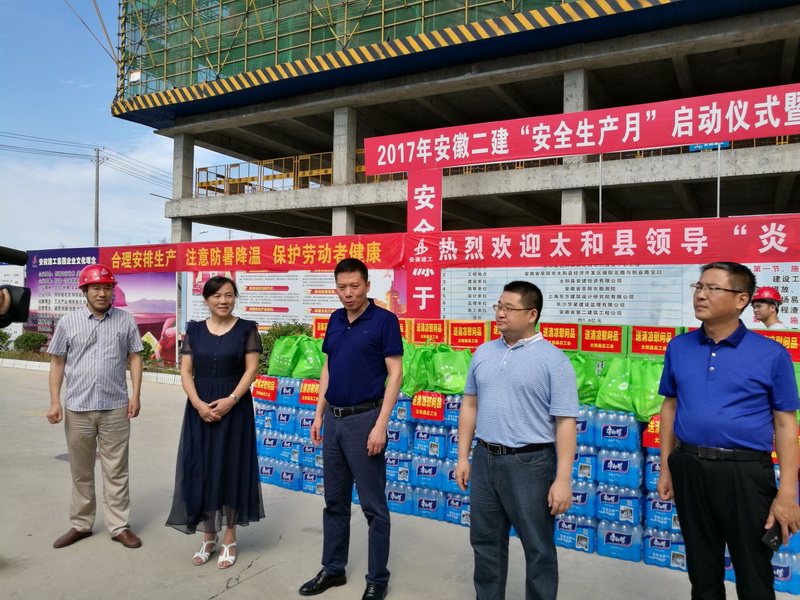 在生物島項(xiàng)目施工現(xiàn)場(chǎng),縣委書記楊波,縣委副書記、縣長(zhǎng)劉牧愚一行將防暑降溫物品一一送到建設(shè)者手中并與他們親切握手,感謝他們?yōu)樘涂h經(jīng)濟(jì)發(fā)展做出的積極貢獻(xiàn),并再三叮囑項(xiàng)目公司做好高溫天氣下的防暑降溫工作,注意勞逸結(jié)合,確保施工安全。楊波對(duì)項(xiàng)目的進(jìn)展情況進(jìn)行了詳細(xì)調(diào)研并就項(xiàng)目進(jìn)度等有關(guān)問(wèn)題,與安建投資公司副總經(jīng)理朱友良,太和縣PPP項(xiàng)目公司總經(jīng)理高偉進(jìn)行交流和溝通。
