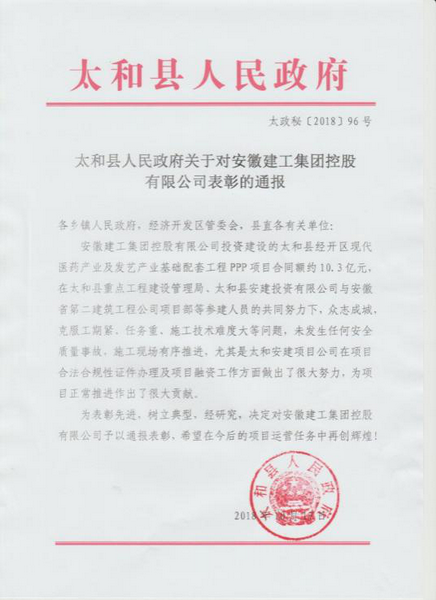 2018年10月17日,安徽建工集團(tuán)控股有限公司投資建設(shè)的太和縣PPP項(xiàng)目喜獲太和縣人民政府全縣通報(bào)表彰!