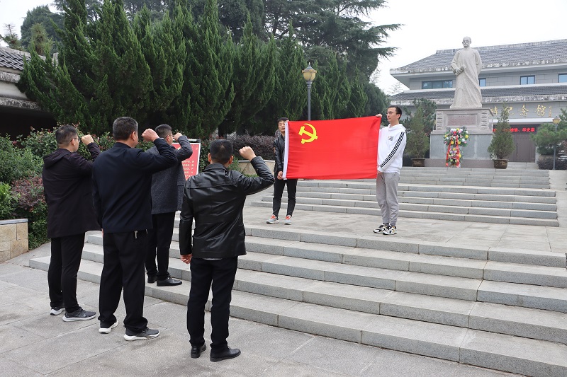 在烈士紀念廣場,全體黨員及青年團員向魏野疇烈士紀念像敬獻花籃,表達對革命烈士的崇高敬意。隨后支部書記帶領全體黨員,面向黨旗,重溫入黨誓詞。