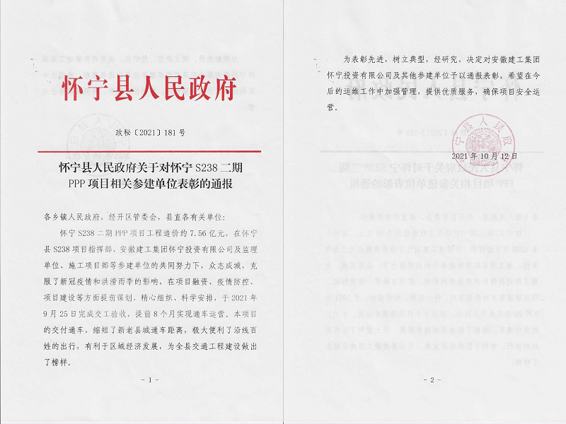 近日,安建投資懷寧PPP項目受到懷寧縣人民政府通報表彰。