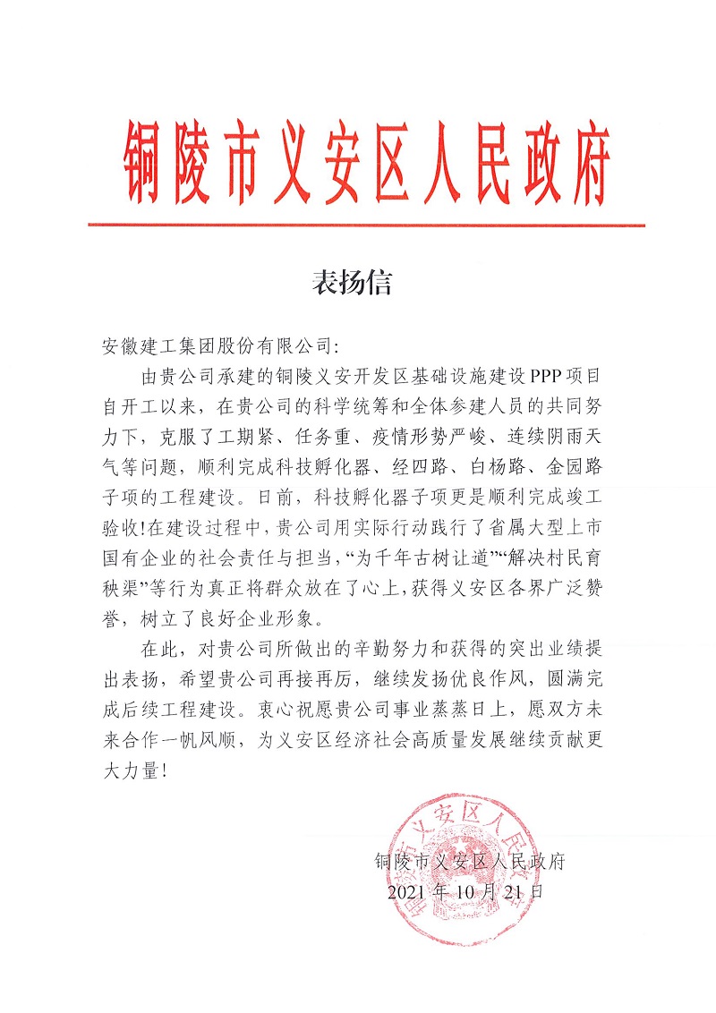 10月21日,銅陵市義安區(qū)政府向安徽建工集團(tuán)股份有限公司發(fā)來表揚(yáng)信,高度認(rèn)可并贊揚(yáng)了公司投資建設(shè)的義安區(qū)城市基礎(chǔ)設(shè)施建設(shè)PPP項(xiàng)目工程取得的優(yōu)異成績,充分肯定安徽建工的建設(shè)實(shí)力、責(zé)任擔(dān)當(dāng)、文化精神和良好企業(yè)形象。