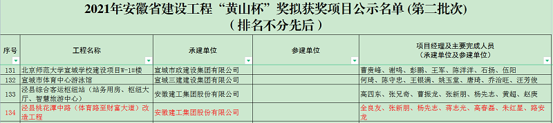 近日,根據(jù)由安徽省住房和城鄉(xiāng)建設(shè)廳、交通運(yùn)輸廳、水利廳聯(lián)合發(fā)布的《關(guān)于2021年安徽省建設(shè)工程“黃山杯”獎擬獲獎項目名單 (第二批次)的公示》,安建投資涇縣PPP項目桃花潭中路改造工程喜獲省優(yōu)質(zhì)工程“黃山杯”。