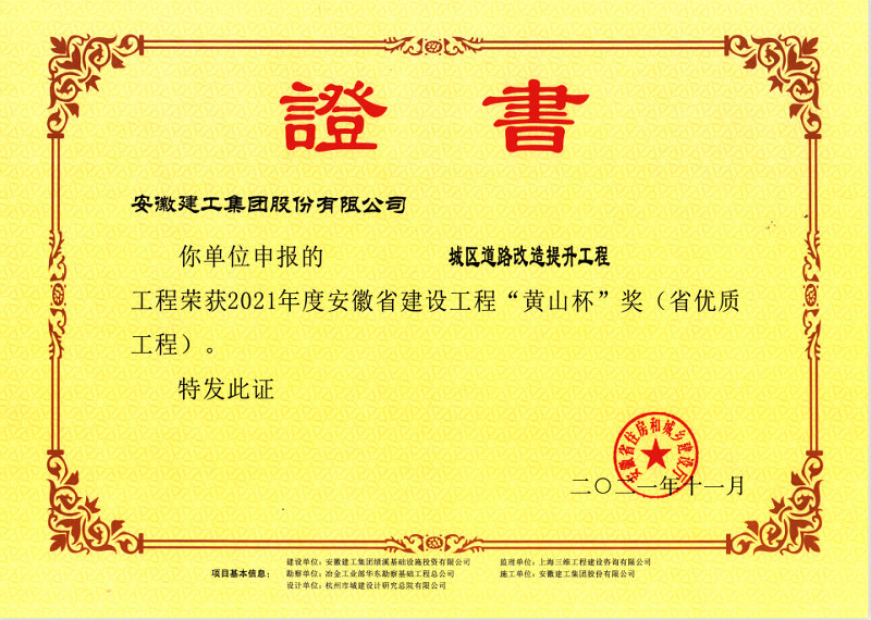 近日,安建投資績(jī)溪PPP項(xiàng)目城區(qū)改造提升工程喜獲2021年度安徽省建設(shè)工程“黃山杯”獎(jiǎng)(省優(yōu)質(zhì)工程)。