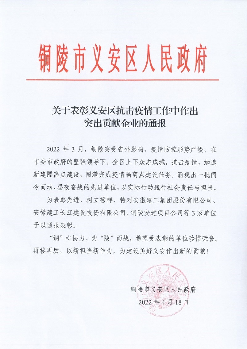 4月18日,銅陵市義安區(qū)人民政府對(duì)安建投資銅陵項(xiàng)目公司在抗擊疫情工作中作出的突出貢獻(xiàn)予以通報(bào)表彰,高度贊揚(yáng)安徽建工的建設(shè)實(shí)力、責(zé)任擔(dān)當(dāng)和文化精神。