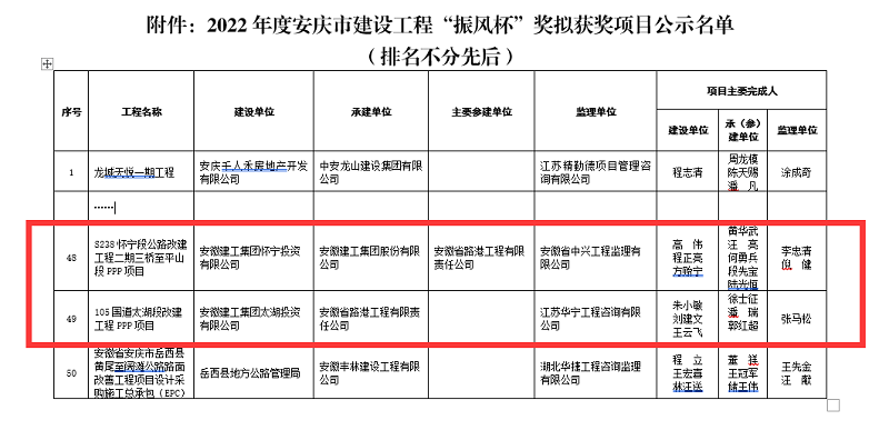 近日,2022年度安慶市建設(shè)工程“振風(fēng)杯”獎(jiǎng)項(xiàng)獲獎(jiǎng)項(xiàng)目名單正式公示,由安徽建工投資建設(shè)的懷寧S238二期PPP項(xiàng)目、太湖G105PPP項(xiàng)目經(jīng)安慶市住房和城鄉(xiāng)建設(shè)局審定,榮獲2022年度安慶市建設(shè)工程“振風(fēng)杯”獎(jiǎng)。