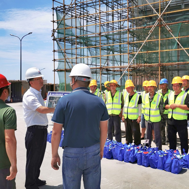 8月14日上午,嵊泗縣縣委書記鄔劍波赴建工投資嵊泗旅游交通集散中心項目慰問一線工作人員,為大家送上防暑降溫物資,并就項目進(jìn)度、安全生產(chǎn)等工作提出具體要求。