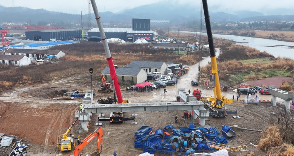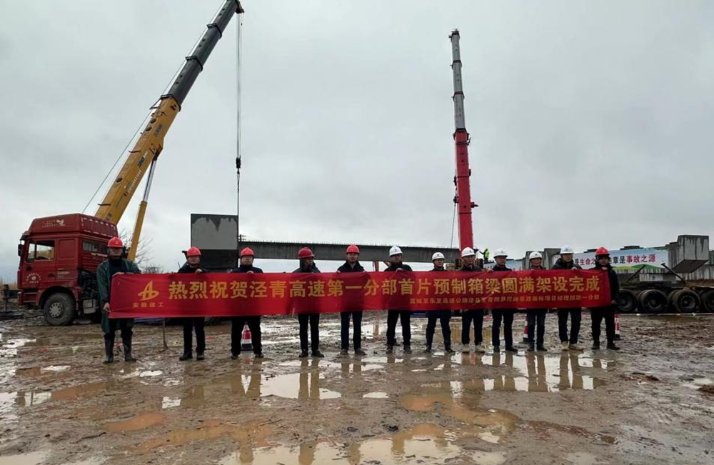 1月18日上午,經(jīng)過停穩(wěn)、起吊、推送、橫移、落梁近半個(gè)多小時(shí)的有序作業(yè),涇青高速項(xiàng)目首片箱梁精準(zhǔn)平穩(wěn)的架設(shè)在徽水河大橋橋墩上,預(yù)制箱梁安裝首件工程順利完成。