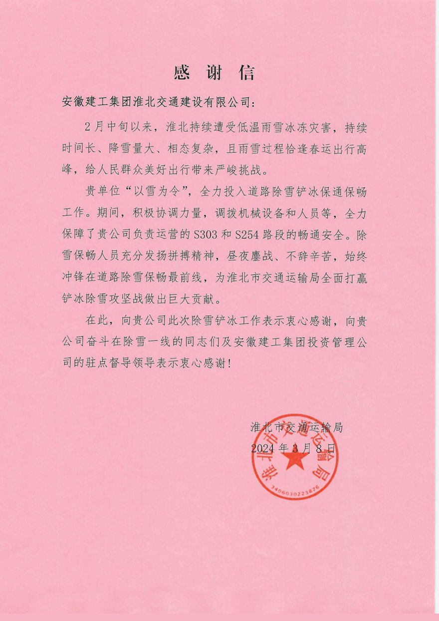 表揚(yáng)信指出,項(xiàng)目公司在2月的低溫雨雪災(zāi)害中充分發(fā)揮拼搏精神,晝夜鏖戰(zhàn)、不辭辛苦,始終沖鋒在道路除雪保障最前線,為淮北市全面打贏鏟冰除雪攻堅(jiān)戰(zhàn)做出巨大貢獻(xiàn)。