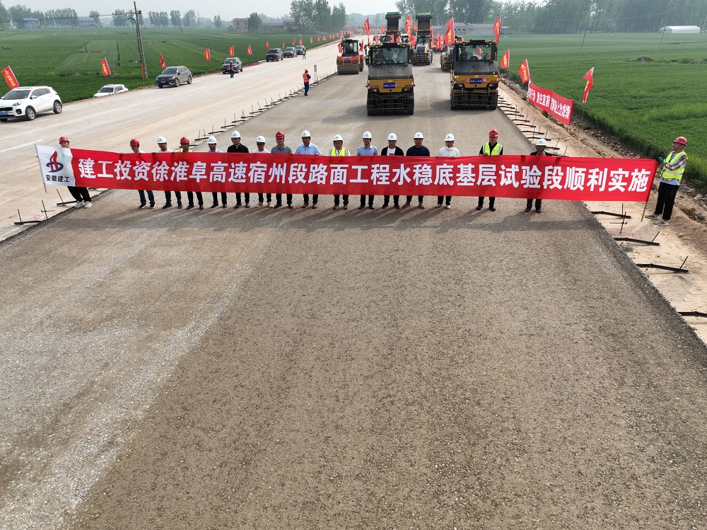建工投資徐淮阜高速宿州段路面工程水穩(wěn)底基層試驗(yàn)段順利完成攤鋪