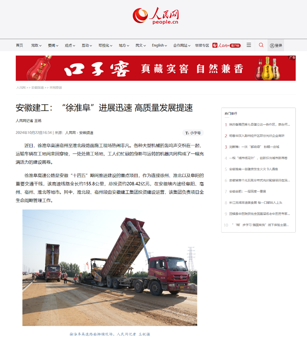近日,人民網(wǎng)安徽頻道重點報道了安徽建工投資建設(shè)的徐淮阜高速項目。