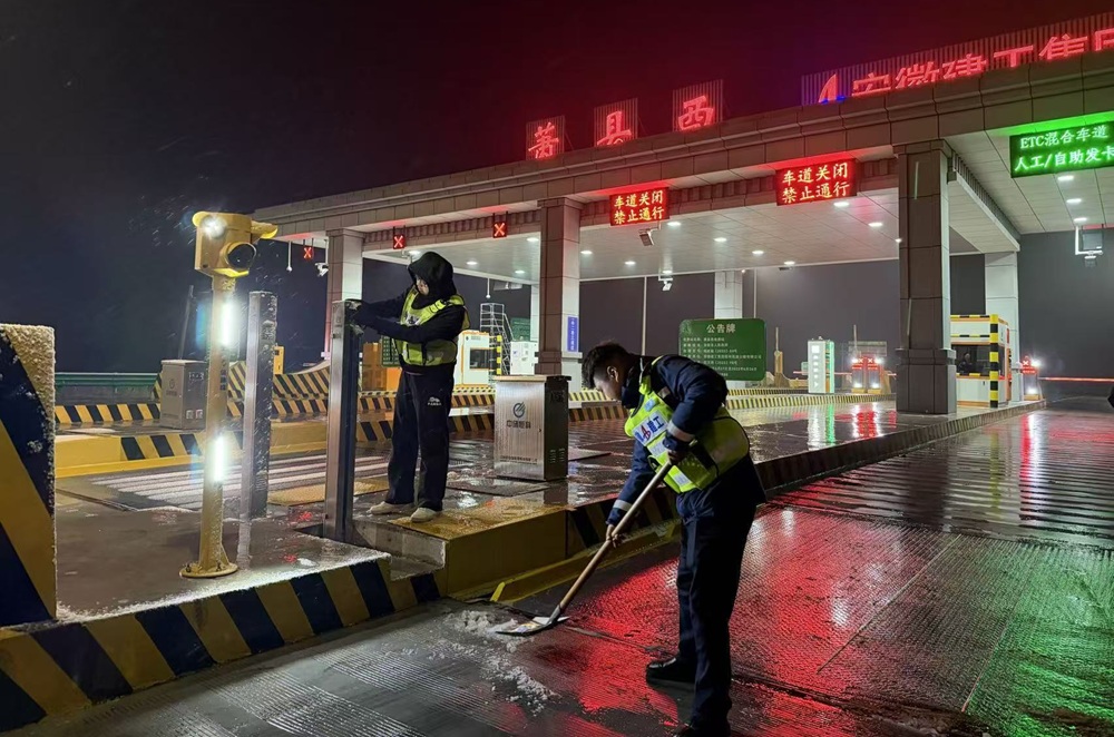 以雪為令,迅即行動(dòng)。傍晚18時(shí),降雪如期而至。多功能除雪車從濉溪北收費(fèi)站出發(fā),開展全線融雪劑撒布作業(yè);各收費(fèi)站工作人員迅速投入清掃,手持雪推、掃帚清理道口積雪,全力保障車輛安全通行。