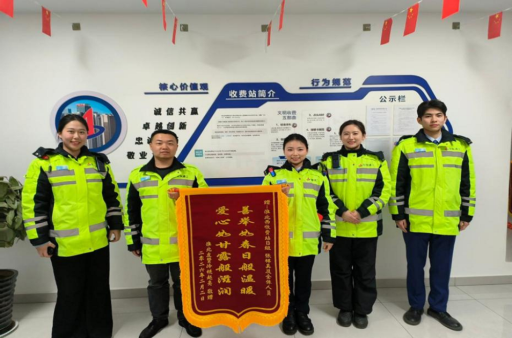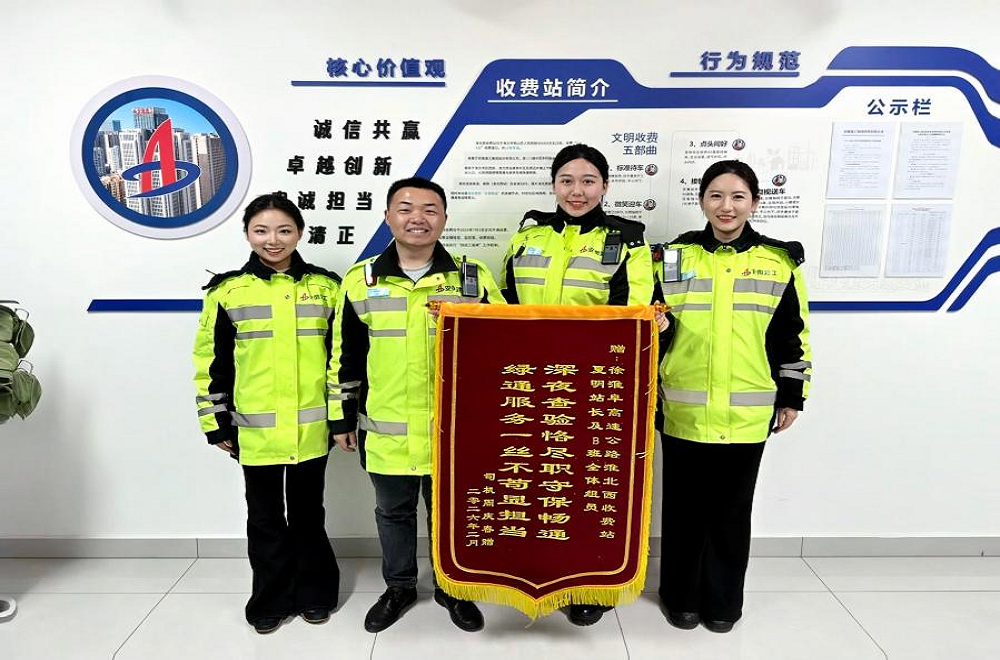 2月1日深夜,徐州方向高速突發(fā)交通事故,大量車輛分流至淮北西站,站口通行壓力陡增。當(dāng)班收費(fèi)員迅速啟動(dòng)應(yīng)急保暢預(yù)案,一邊有序疏導(dǎo)來(lái)往車流,一邊高效開展綠通查驗(yàn),短短2小時(shí)完成規(guī)范核驗(yàn)21輛綠通車。寒風(fēng)中,B班組收費(fèi)人員始終堅(jiān)持微笑服務(wù),耐心解答司乘疑問,綠通司機(jī)周慶春師傅深受感動(dòng),贈(zèng)旗致敬“深夜查驗(yàn)恪盡職守保暢通,綠通服務(wù)一絲不茍顯擔(dān)當(dāng)”。